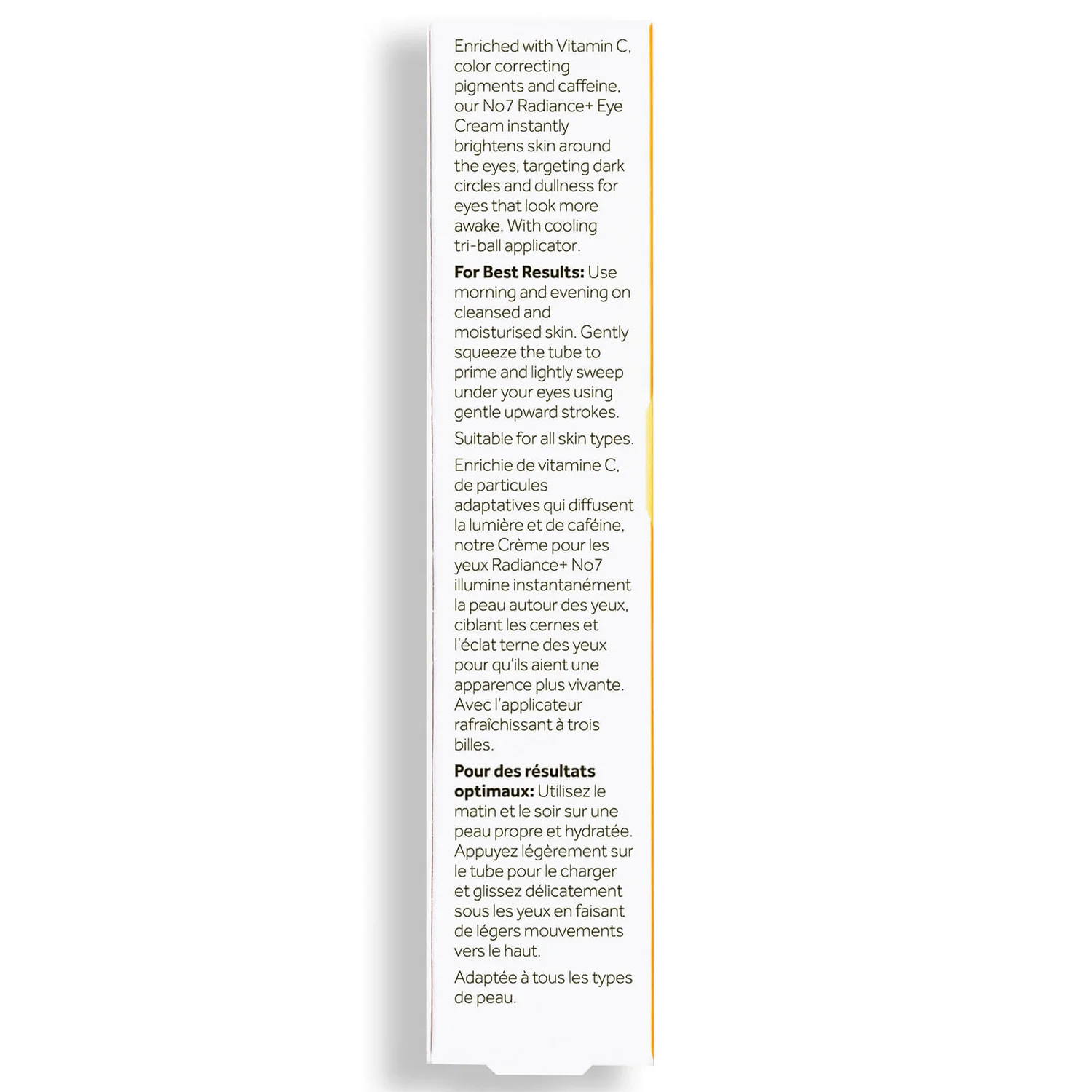 With No7 Radiance+ Bright Eye Roll-on Eye Cream, skin looks brighter. This eye cream for reducing the appearance of dark circles is enriched with vitamin C and caffeine. No7 radiance eye cream instantly brightens the look of delicate skin around the eyes. For best results, use the full range of No7 Radiance+ skincare products. Following serum application, apply under-eye cream after moisturizer. No7 is the UK’s best-kept beauty secret with over 85 years of trusted expertise — exceptional beauty shouldn’t be a luxury. (Claims based on consumer study of UK women over 4 weeks)